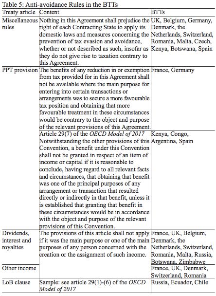 Anti-avoidance rules in China’s BTTs take different forms (see Table 5). In some treaties, it is provided in the article of Miscellaneous Rule dealing with the relationship between domestic anti-avoidance rules and BTTs. Under this provision, the BTT does not prejudice the right of the contracting state to apply its domestic anti-avoidance rules. In some other treaties, the specific anti-abuse rule, i.e. LoB clause, is included which limits the availability of treaty benefits to entities that meet certain conditions. These conditions, which are based on the legal nature, ownership in, and general activities of the entity, seek to ensure that there is a sufficient link between the entity and its resident state. Such LoB provisions are currently found in China’s BTTs with Russia, Ecuador and Chile, and are very likely included at the wish of those jurisdictions.